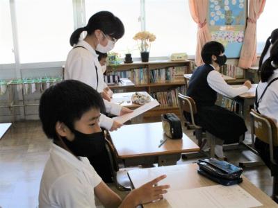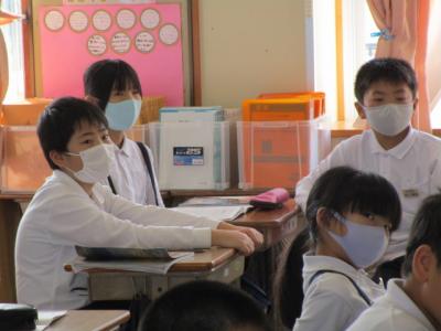 5年生は外国語科で、「直進」「右折」「左折」の勉強をしたり、ノートにまとめたりしていました。