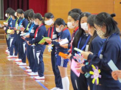 4年生はメッセージカードを渡しました。もらった6年生は、(何が書かれているのかなあ~)と見ていました。