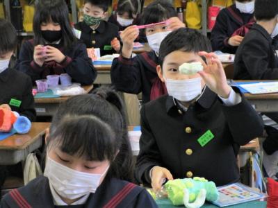 3年生は図工で、立体作品作り。粘土を伸ばしたり丸めたりしながら、思い思いの作品へと仕上げていました。