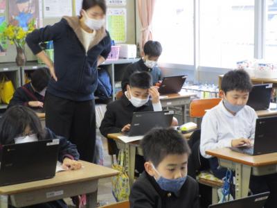 今日はたくさんのクラスでクロームブックを使っていました。5年生は外国語科で、先生からのミッションを解いていました。