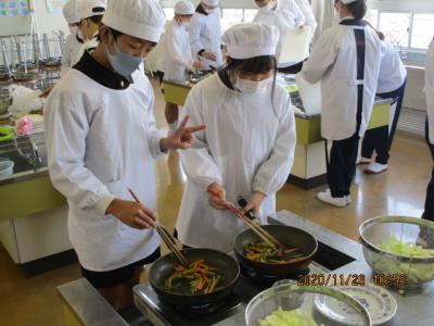 6年生が野菜炒めの調理実習をしていました。どの班も協力し合っていました。とてもいい匂いが広がっていました。