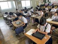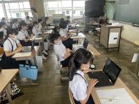 クロームブックが導入されて1年半。今や授業では欠かせないものになっています。一方で、これまで行ってきたノートやワークシートに書くことも大事に取り組んでいます。1人1台端末や大型提示装置などICTを活用する学習方法と板書などの従来の学習方法、それぞれの良さを生かすことで授業の質を高めていきたいと思います。