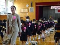 入学式が行われ、35人の1年生が入学しました。担任の先生の後に続いて、ドキドキしながら入場しました。